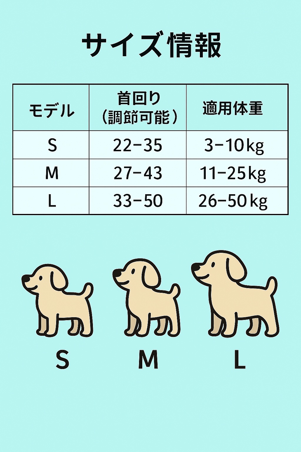 3Mと5Mの2種類の長さ、そしてS・M・Lの首輪サイズからお選びいただけるため、小型犬から中型犬まで幅広く対応可能です。